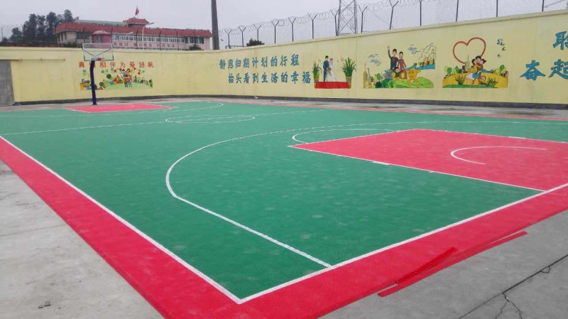 貴州省凱里市某看守所特療中心籃球場拼裝地板采用博超地板公司經(jīng)典小米字格懸浮式拼裝地板,紅色+綠色經(jīng)典搭配... | ||
